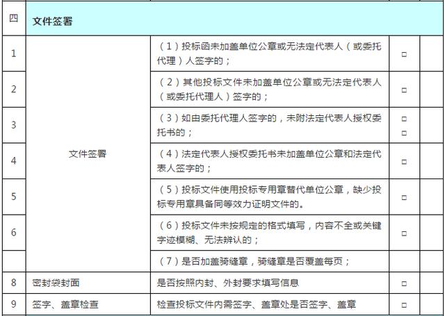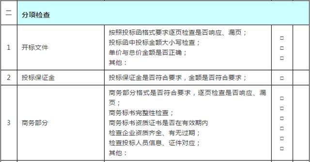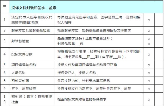 招标人或其委托的招标代理机构,根据招标项目的特点和要求编制招标文件。一般,招标文件至少应包括下列内容: 1、招标人须知; 2. 招标项目的性质、数量; 3. 技术规格; 4. 招标价格的要求及其计算方式; 5. 评标的标准和方法; 6. 交货、竣工或提供服务的时间; 7. 投标人应当提供的有关资格和资信证明文件; 8. 投标保证金的数额或其他形式的担保; 9. 投标文件的编制要求; 10. 提供投标文件的方式、地点和截止时间; 11. 开标、评标的日程安排; 12. 主要合同条款。 二、六步搞定招标文件 1、看资格审查 资格审查是指招标人对资格预审申请人或投标人的经营资格、专业资质、财务状况、 技术能力、管理能力、业绩、信誉等方面评估审查,以判定其是否具有参与项目投标和履行合同的资格及能力。 资格审查是招标项目的必要程序,所以投标人必须要关注。看资格审查,主要是看业绩、规模、财务、人员等等的硬性指标,再看看自己的企业投标有没有硬性门槛。虽然本着鼓励竞争的原则,资格审查一般不会要求太高或者太特殊,但是也要认真对待。 2、看详细审查 主要看招标文件中的一些商务、技术的评分标准。根据自己公司的实力进行大概分析,大概要求什么标准,客观分(比如业绩、财务情况、进度安排等)和主观分(比如方案等)怎样拿高分,根据这些制定投标策略,寻找自己的优势,弥补自己的劣势,做到心中有谱。 3、看投标人须知前附表 细看投标人须知前附表,这里面涵盖的都是关键性条款,认真研读有助于理清楚整个投标文件要怎么做,尤其是包含一些不可偏离条款(实质性条款)。 4、看合同部分 结合商务不可偏离条款,看合同大致要求,结算方式,付款条件等等。 5、看技术规范书 这部分要和技术人员详细充分交流,尽量或者完全满足招标人的要求。 6、记住关键点 关键点一般包括:公示期,投标截止日期,保函或者保证金,投标开标地点,文件格式(比如关键页的签字盖章)等等。 三、易犯的错误 根据招标文件,好不容易辛苦制作的标书,却在开标时因为一些细节未注意而遭遇废标。按照下面这个表来检查,5分钟妥妥搞定!
