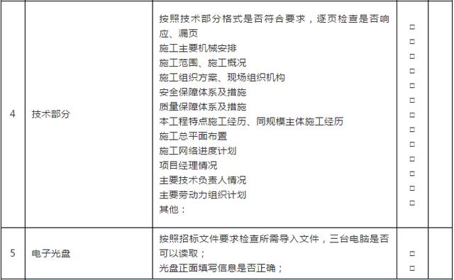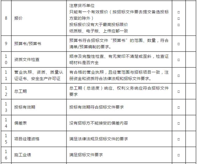 一、封面: 1、封面格式是否与招标文件要求格式一致,文字打印是否有错字。 2、封面标段、里程是否与所投标段、里程一致。 3、企业法人或委托代理人是否按照规定签字或盖章,是否按规定加盖单位公章,投标单位名称是否与资格审查时的单位名称相符。 4、投标日期是否正确。 二、目录: 5、目录内容从顺序到文字表述是否与招标文件要求一致。 6、目录编号、页码、标题是否与内容编号、页码(内容首页)、标题一致。 三、投标书及投标书附录: 7、投标书格式、标段、里程是否与招标文件规定相符,建设单位名称与招标单位名称是否正确。 8、报价金额是否与“投标报价汇总表合计”、“投标报价汇总表”、“综合报价表”一致,大小写是否一致,国际标中英文标书报价金额是否一致。 9、投标书所示工期是否满足招标文件要求。 10、投标书是否按已按要求盖公章。 11、法人代表或委托代理人是否按要求签字或盖章。 12、投标书日期是否正确,是否与封面所示吻合。 四、修改高价的声明书(或降价函): 13、修改报价的声明书是否内容与投标书相同。 14、降价函是否按招标文件要求装订或单独递送。 五、授权书、银行保函、信贷证明: 15、授权书、银行保函、信贷证明是否按照招标文件要求格式填写。 16、上述三项是否由法人正确签字或盖章。 17、委托代理人是否正确签字或盖章。 18、委托书日期是否正确。 19、委托权限是否满足招标文件要求,单位公章加盖完善。 20、信贷证明中信贷数额是否符合业主明示要求,如业主无明示,是否符合标段总价的一定比例。 六、报价: 21、报价编制说明要符合招标文件要求,繁简得当。 22、报价表格式是否按照招标文件要求格式,子目排序是否正确。 23、“投标报价汇总表合计”、“投标报价汇总表”、“综合报价表”及其他报价表是否按照招标文件规定填写,编制人、审核人、投标人是否按规定签字盖章。 24、“投标报价汇总表合计”与“投标报价汇总表”的数字是否吻合,是否有算术错误。 25、“投标报价汇总表”与“综合报价表”的数字是否吻合,是否有算术错误。 26、“综合报价表”的单价与“单项概预算表”的指标是否吻合,是否有算术错误。“综合报价表”费用是否齐全,特别是来回改动时要特别注意。 27、“单项概预算表”与“补充单价分析表”、“运杂费单价分析表”的数字是否吻合,工程数量与招标工程量清单是否一致,是否有算术错误。 28、“补充单价分析表”、“运杂费单价分析表”是否有偏高、偏低现象,分析原因,所用工、料、机单价是否合理、准确,以免产生不平衡报价。 29、“运杂费单价分析表”所用运距是否符合招标文件规定,是否符合调查实际。 30、配合辅助工程费是否与标段设计概算相接近,降造幅度是否满足招标文件要求,是否与投标书其他内容的有关说明一致,招标文件要求的其他报价资料是否准确、齐全。 31、定额套用是否与施工组织设计安排的施工方法一致,机具配置尽量与施工方案相吻合,避免工料机统计表与机具配置表出现较大差异。 32、定额计量单位、数量与报价项目单位、数量是否相符合。 33、“工程量清单”表中工程项目所含内容与套用定额是否一致。 34、“投标报价汇总表”、“工程量清单”采用Excel表自动计算,数量乘单价是否等于合价(合价按四舍五入规则取整)。合计项目反求单价,单价保留两位小数。 七、对招标文件及合同条款的确认和承诺: 35、投标书承诺与招标文件要求是否吻合。 36、承诺内容与投标书其他有关内容是否一致。 37、承诺是否函盖了招标文件的所有内容,是否实质上响应了招标文件的全部内容及招标单位的意图。野猪在招标文件中隐含的分包工程等要求,投标文件在实质上是否予以响应。 38、招标文件要求逐条承诺的内容是否逐条承诺。 39、对招标文件(含补遗书)及合同条款的确认和承诺,是否确认了全部内容和全部条款,不能只确认、承诺主要条款,用词要确切,不允许有保留或留有其他余地。 八、施工组织及施工进度安排: 40、工程概况是否准确描述。 42、计划开竣工日期是否符合招标文件中工期安排与规定,分项工程的阶段工期、节点工期是否满足招标文件规定。工期提前要合理,要有相应措施,不能提前的决不提前,如铺架工程工期。 42、工期的文字叙述、施工顺序安排与“形象进度图”、“横道图”、“网络图”是否一致,特别是铺架工程工期要针对具体情况仔细安排,以免造成与实际情况不符的现象。 43、总体部署:施工队伍及主要负责人与资审方案是否一致,文字叙述与“平面图”、“组织机构框图”、“人员简历”及拟人职务等是否吻合。 44、施工方案与施工方法、工艺是否匹配。 45、施工方案与招标文件要求、投标书有关承诺是否一致。材料供应是否与甲方要求一致,是否统一代储代运,是否甲方供应或招标采购。临时通信方案是否按招标文件要求办理。(有要求架空线的,不能按无线报价)。施工队伍数量是否按照招标文件规定配置。 46、工程进度计划:总工期是否满足招标文件要求,关键工程工期是否满足招标文件要求。 47、特殊工程项目是否有特殊安排:在冬季施工的项目措施要得当,影响质量的必须停工,膨胀土雨季要考虑停工,跨越季节性河流的桥涵基础雨季前要完成,工序、工期安