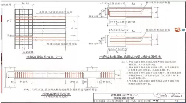 ①掌握框架扁梁边柱节点构造要求。(直锚0.5B指自身宽度)
