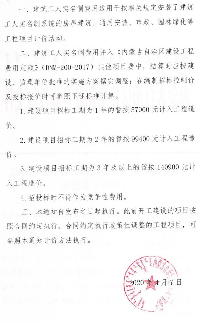 近日,内蒙古住建厅发布了《建筑工人实名制费用计价方法(暂行)》,自发布之日起执行。在编制招标控制价及投标报价时,可参照下述标准计算: