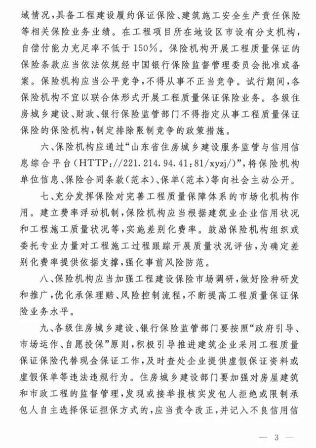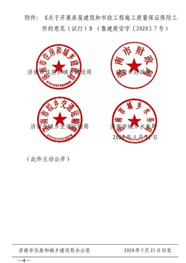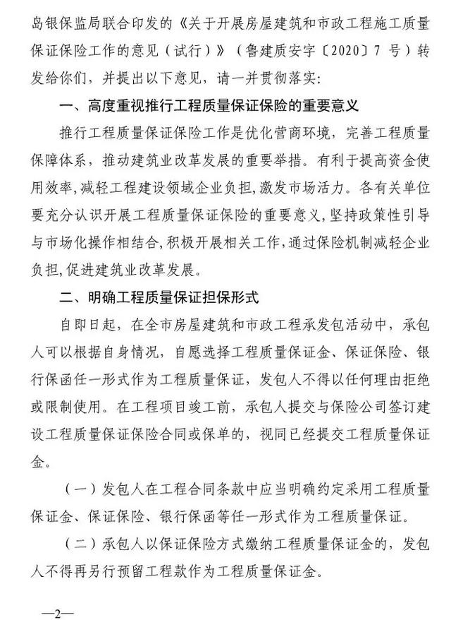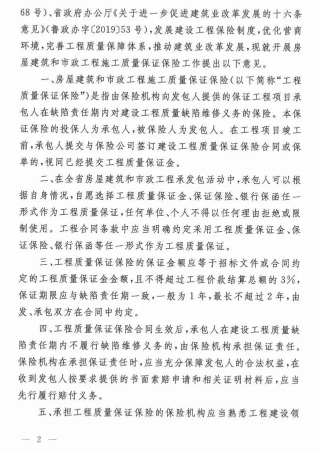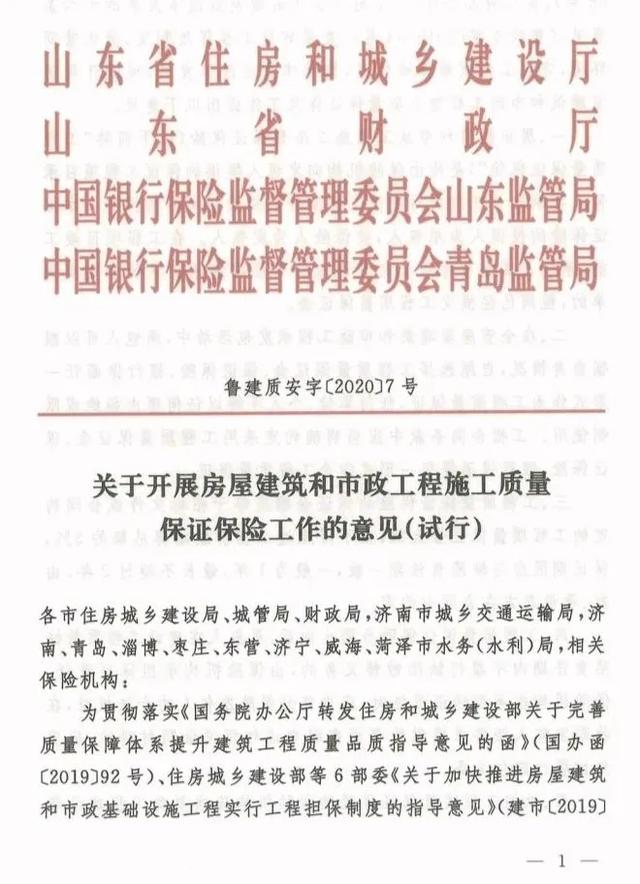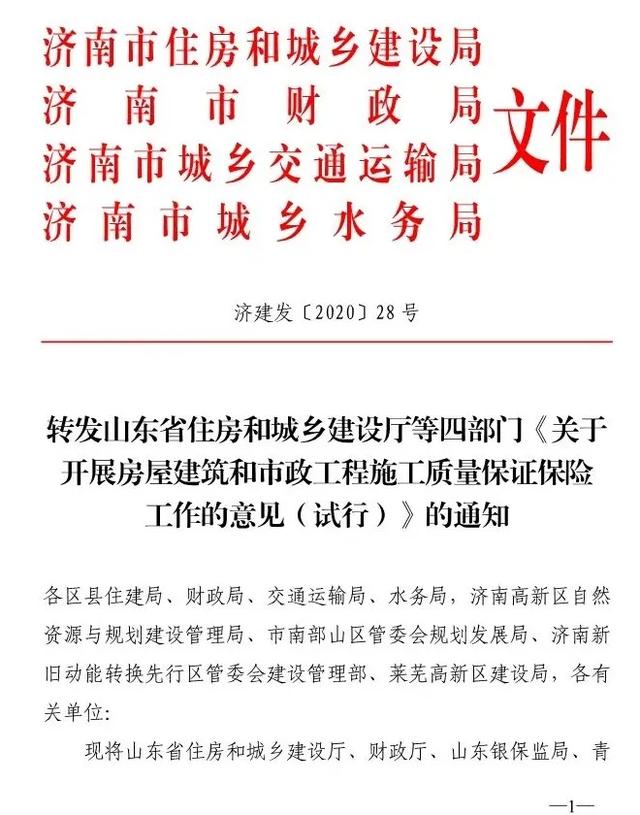 近日,济南市住建局转发[山东省住房和城乡建设厅等四部门《关于开展房屋建筑和市政工程施工质量保证保险工作的意见(试行)》的通知]。