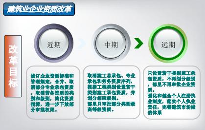 2014年7月1日,住房城乡建设部颁布《关于推进建筑业发展和改革的若干意见》,首次提出:坚持淡化工程建设企业资质、强化个人执业资格的改革方向,探索从主要依靠资质管理等行政手段实施市场准入,逐步转变为充分发挥社会信用、工程担保、保险等市场机制的作用,实现市场优胜劣汰。加快研究修订工程建设企业资质标准和管理规定,取消部分资质类别设置,合并业务范围相近的企业资质,合理设置资质标准条件,注重对企业、人员信用状况、质量安全等指标的考核,强化资质审批后的动态监管;简政放权,推进审批权限下放,健全完善工程建设企业资质和个人执业资格审查制度;改进审批方式,推进电子化审查,加大公开公示力度。