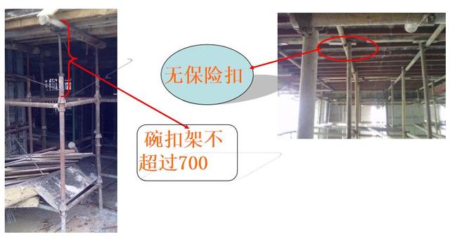 2)支模架不设扫地杆,立、横杆间距过大,防滑保险扣件未扣,上部不设纵横水平杆。