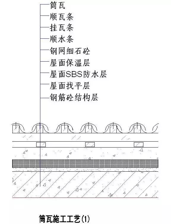 1)施工工序依次为:混凝土结构层-找平层-40X8顺水条-防水层-顺水条(嵌套保温板)-挂瓦条-顺瓦条-筒瓦。