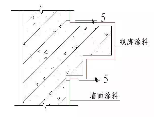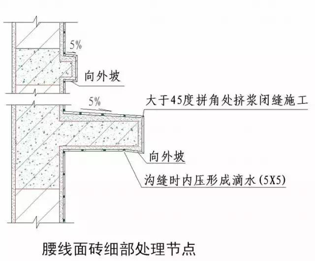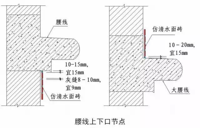 面砖在粘贴时,在面砖与上腰线之间留出10-15mm(宜15mm),线条上涂料跟下5mm,面砖与下腰线之间留出10-20mm(宜15mm)。
