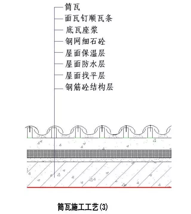 1)施工工序依次为:混凝土结构层-找平层-防水层-顺水条(嵌套保温板)-挂瓦条-顺瓦条-筒瓦。