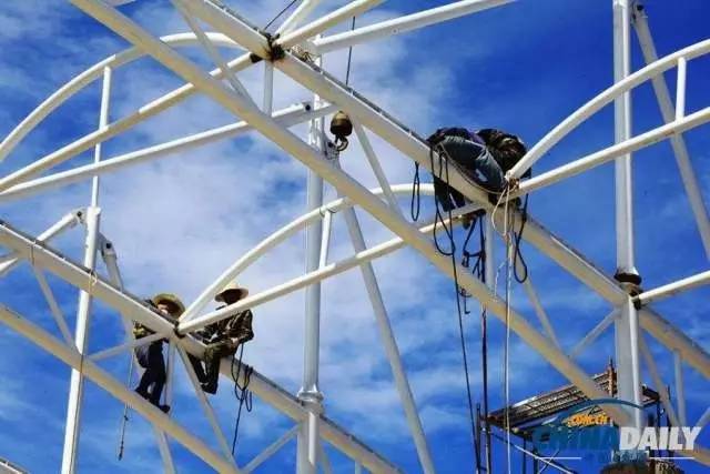 ⑦ 工人严格按要求配戴安全劳保用品安全带、安全帽等严防高空坠落。