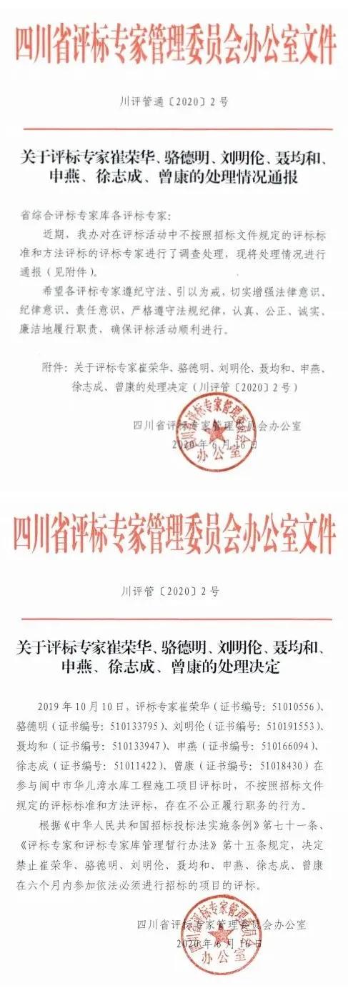 6月16日,四川省评标专家管理委员会办公室发布《关于评标专家罗顺贵、巫光清、奚希、杨晓波、朱琳的处理情况通报》和《关于评标专家崔荣华、骆德明、刘明伦、聂均和、申燕、徐志成、曾康的处理情况通报》,给予以下处罚:
