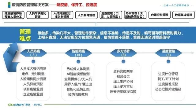 “数字建筑”将成为转型的核心引擎 “新基建”悄然走红,成了整个数字经济发展“基础设施”,催生数字经济新产业形态的“催化剂”。未来我国5G网络、大数据中心等建设将进一步加快,与“新型基础设施建设”相关联的产业和行业将获得重大利好。建筑业的数字化转型也引来快车道。建筑施工企业又该如何实现数字化转型也成为必须回答的问题呢?这主要包括数字化企业—在线化企业—智能化企业三个层面。 1)数字化是指实现生产过程的对象用数字来表述。包括岗位级别的数字化,建筑构件和工艺、工法的数字化,生产装备、工地场地全要素的数字化,材料被加工的零部件、现场模架等“物”的数字化以及人的数字化。 2)在线化,就是企业内外的各要素,及其和用户、产业上下游企业及产品等实现网络连接,实时在线。 3)而智能化,通过人工智能的深度学习、迁移学习、增强学习等技术的应用,把工程项目管理和施工现场等各种信息“自动地”被加工成为知识,汇聚在“企业大脑”,实现了企业知识的生成、积累、应用和传承,形成了“数字企业到智慧企业的嬗变”。 这次疫情就让我们看到建设企业数字化转型的一些亮眼的成果: 1)智慧工地和新建造——万人关注的武汉蔡甸火神山医院,正式完工交付使用,距离立项仅仅过去了10天时间。 从已有图纸的整理,到协同设计,再到协同现场施工,如果没有数字化技术的支撑,这样的速度是难以想象的。 而在建设施工过程智中,无人机的应用更是在各方资源有限的情况下,代替人力高效完成各项勘测、巡检等工作;而后来5G、云计算、人工智能等技术的应用,更是成为医院的标配。 2)数字化供应链——除了火神山协同设计、智慧工地等场景外,建筑业的供应链数字化整合也在这次疫情中发挥了过去所没有被人重视的威力,为抗击新型冠状病毒感染的肺炎疫情,武汉两座专门医院火神山医院、雷神山医院正如火如荼地建设中。 在建设过程中,及时解决建设材料物资供应是首要任务。作为数字建筑平台服务商的广联达,旗下平方网-供采精准对接服务全面响应,全力支持火神山及后续武汉防疫建材需求,很快就获得了首批80家建材供应商驰援火神山医院建设,这种聚合海量龙头企业、名牌认证供应商资源的平台整合发挥了重要作用。 3)智慧项目管理大脑——当然还有对“人机料法环”等统筹性管理中,这次疫情也让我们看到了数字化转型的前景。 如:广联达的疫情防护解决方案,利用IoT与BIM技术,将现场系统和硬件集成到统一平台,实现人员快速测温监控,现场视频监控无死角,利用AI技术识别现场违规行为,及时预警,并通过视频会议实现集团与项目的远程沟通,为项目管理层建设一个劳务人员数据可跟踪、生产过程全面掌握、项目疫情风险有效降低的“项目大脑”,这些在疫情中有效,在疫情后推动建设企业的精益化管理、在质量、安全的全过程数字化管理中也已然适用。
