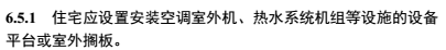 明确了空调室外机等设备安装平台,提升了新建建筑安全度。 针对浙江省空调室外机安装缺少专门的安装平台,住户多采用铁质三角支架,容易造成安全隐患的问题,标准第6.5.1条强制规定“住宅应设置安装空调室外机、热水系统机组等设施的设备平台或室外搁板”,在设计环节即作出明确要求,从根本上解决空调室外机安装的安全隐患。