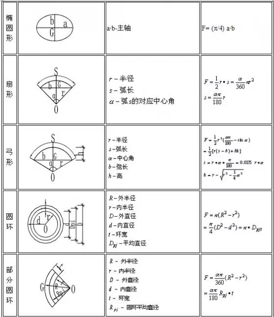 l-弧长,b-弦长,h-矢高,r-半径,α-圆心角的度数S=r2/2·(πα/180-sinα)=r2arccos[(r-h)/r] - (r-h)(2rh-h2)1/2=παr2/360 - b/2·[r2-(b/2)2]1/2=r(l-b)/2 + bh/2≈2bh/3
