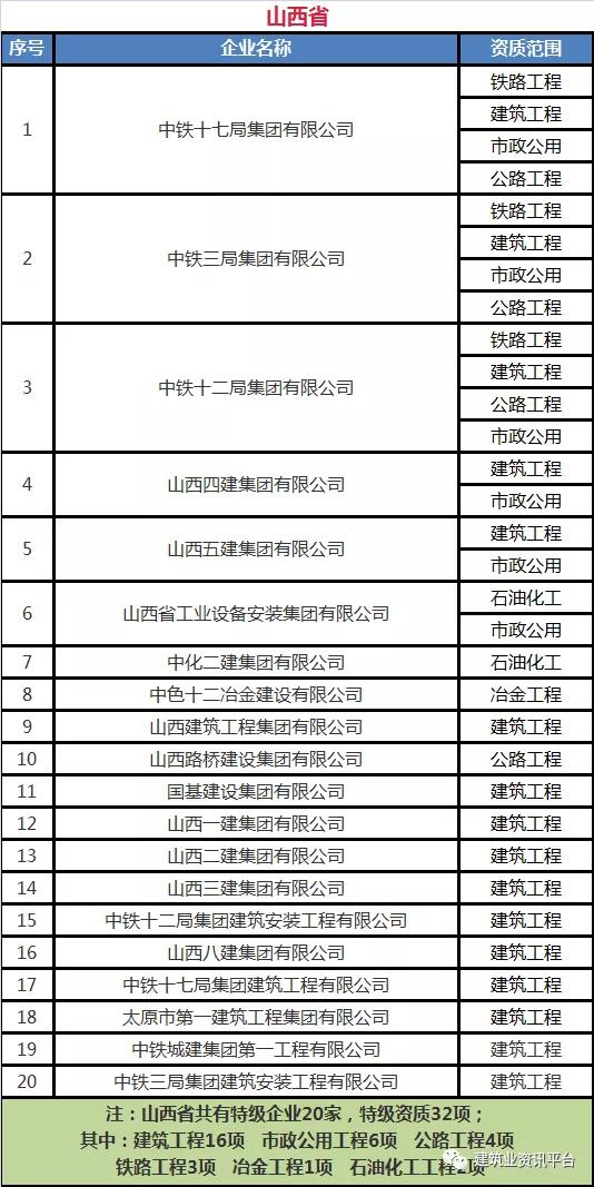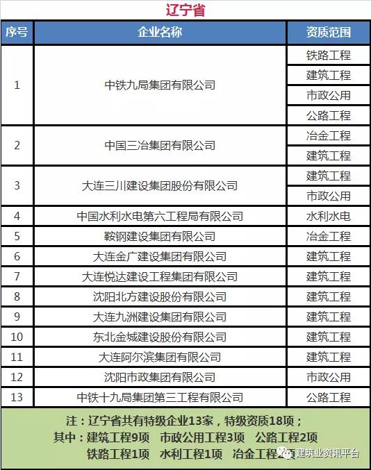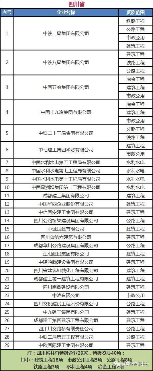 各省、自治区、直辖市特级企业名单