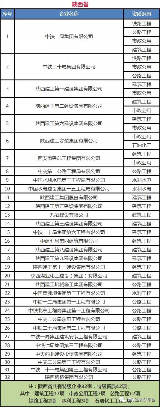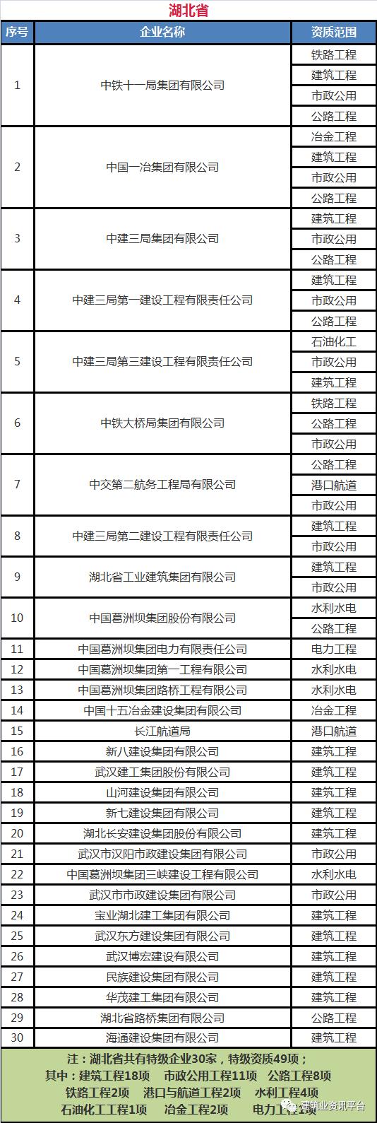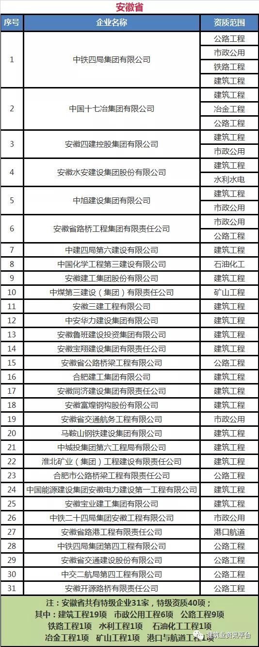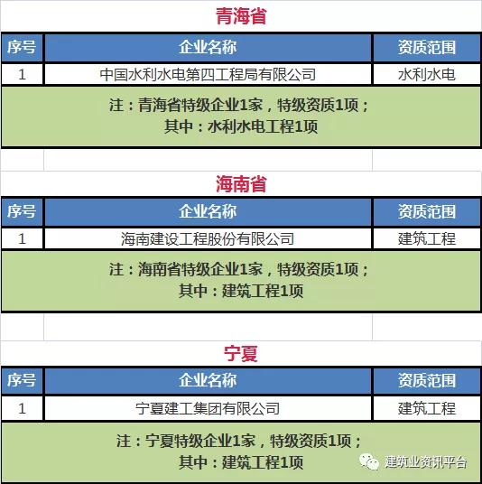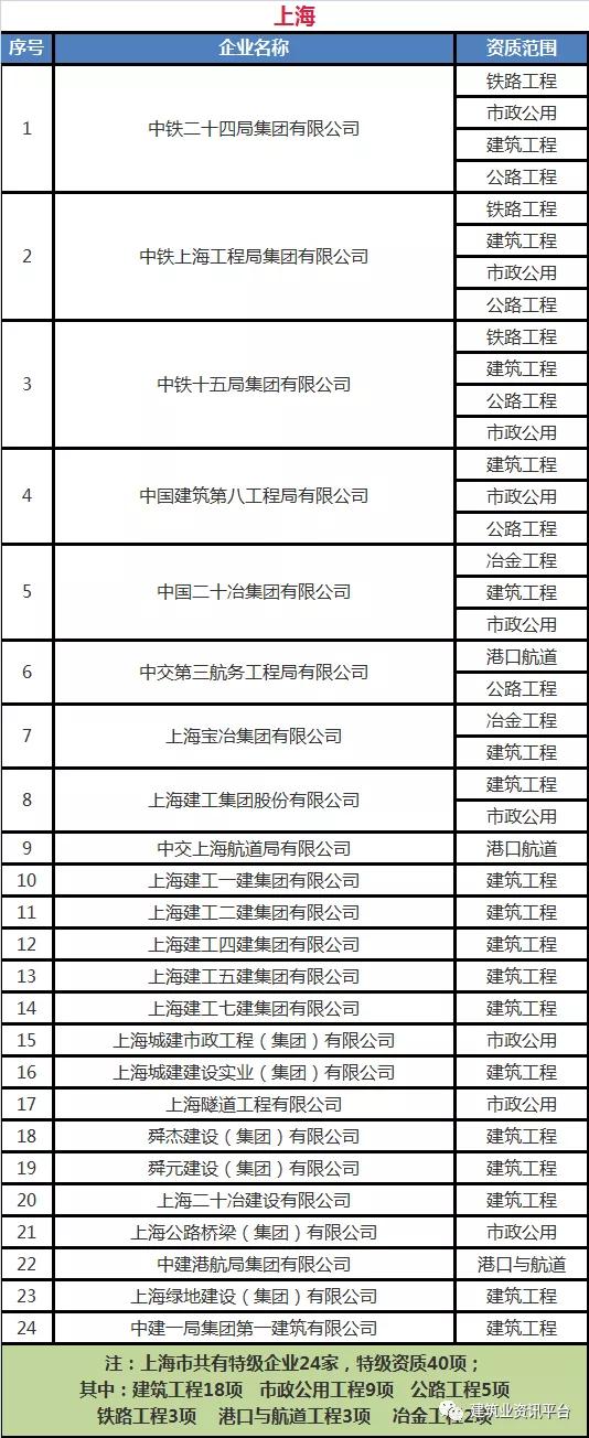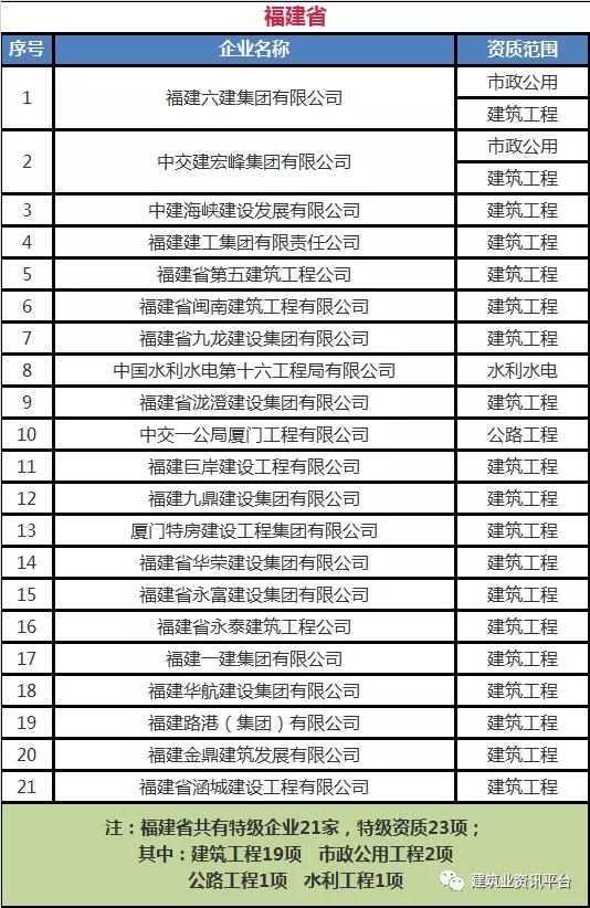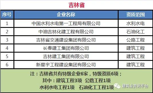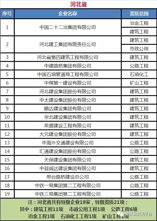 以下为全国各省、自治区、直辖市各类别施工总承包特级资质的企业名单: