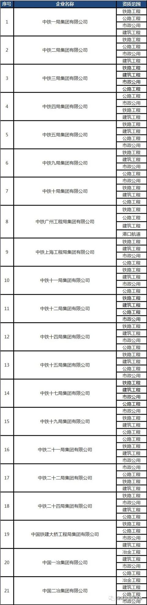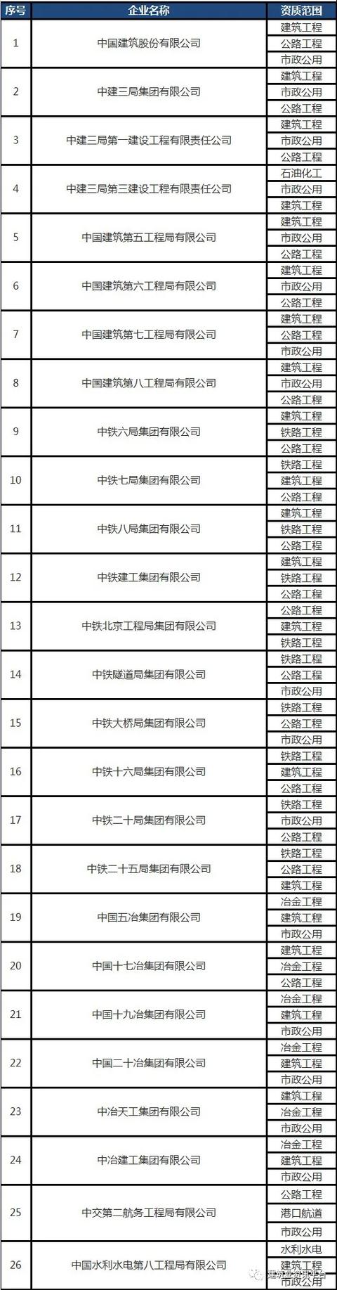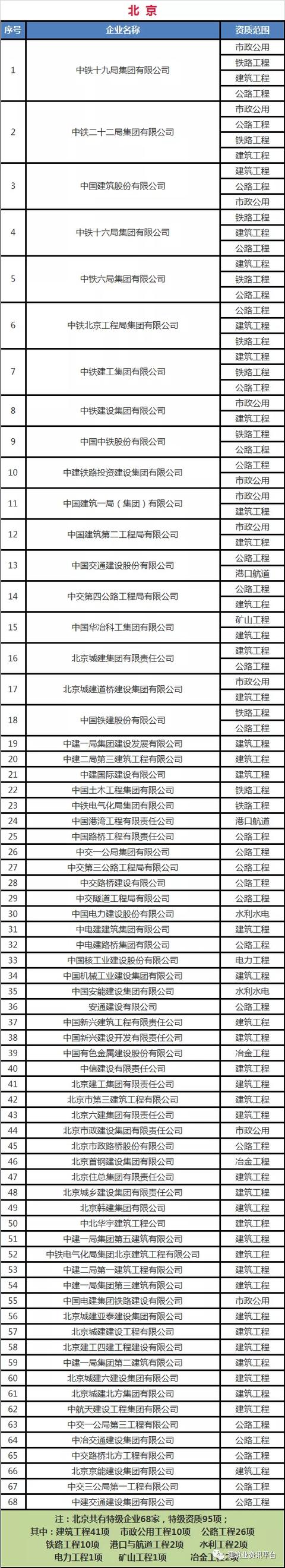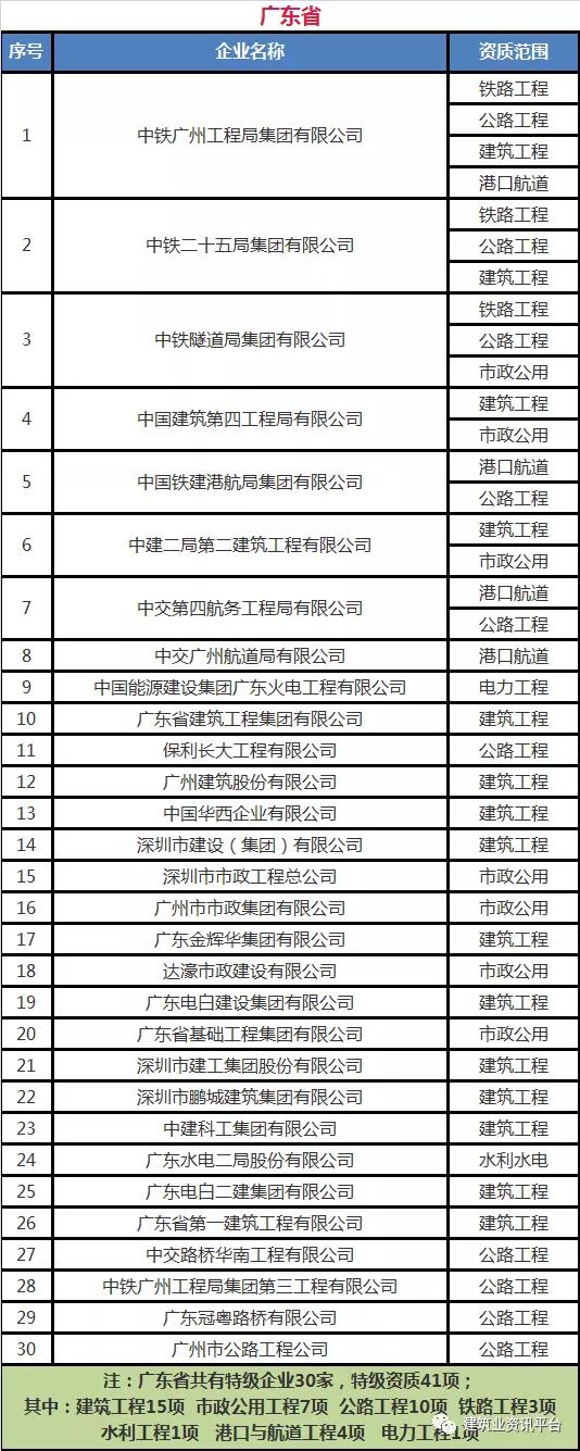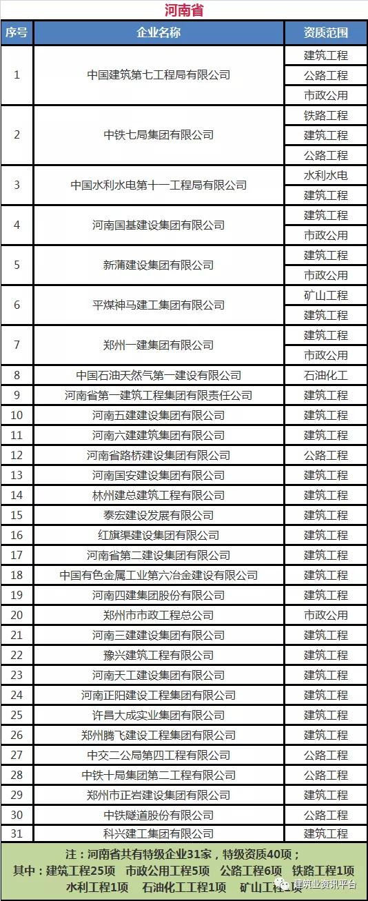 以下为全国各省、自治区、直辖市各类别施工总承包特级资质的企业名单: