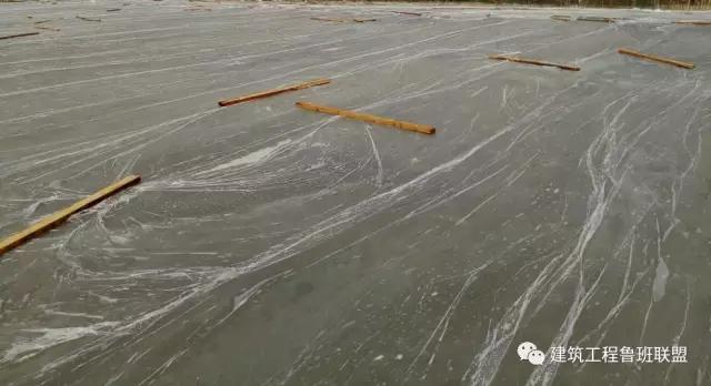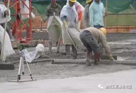 工艺原理:混凝土收面过程中,采用6m铝合金靠尺,以倒“V”字钢筋控制点为基准点收平。混凝土刚刚盖过控制点为准。