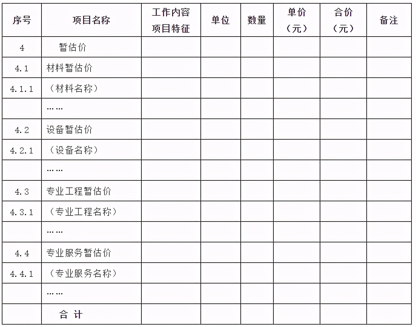 (四)暂估价:根据项目实际设置,具体数量和金额由招标人报项目所属建设行政主管部门批准后给定,并计入合同价。