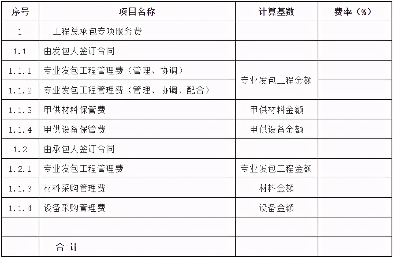 注:1、以暂估价形式包括在总承包范围内的专业工程、设备和主材,应根据合同约定签约方式不同,填写表5-1工程总承包专项服务费计价表,计取相应的专业发包工程管理费、材料保管费和设备保管费;