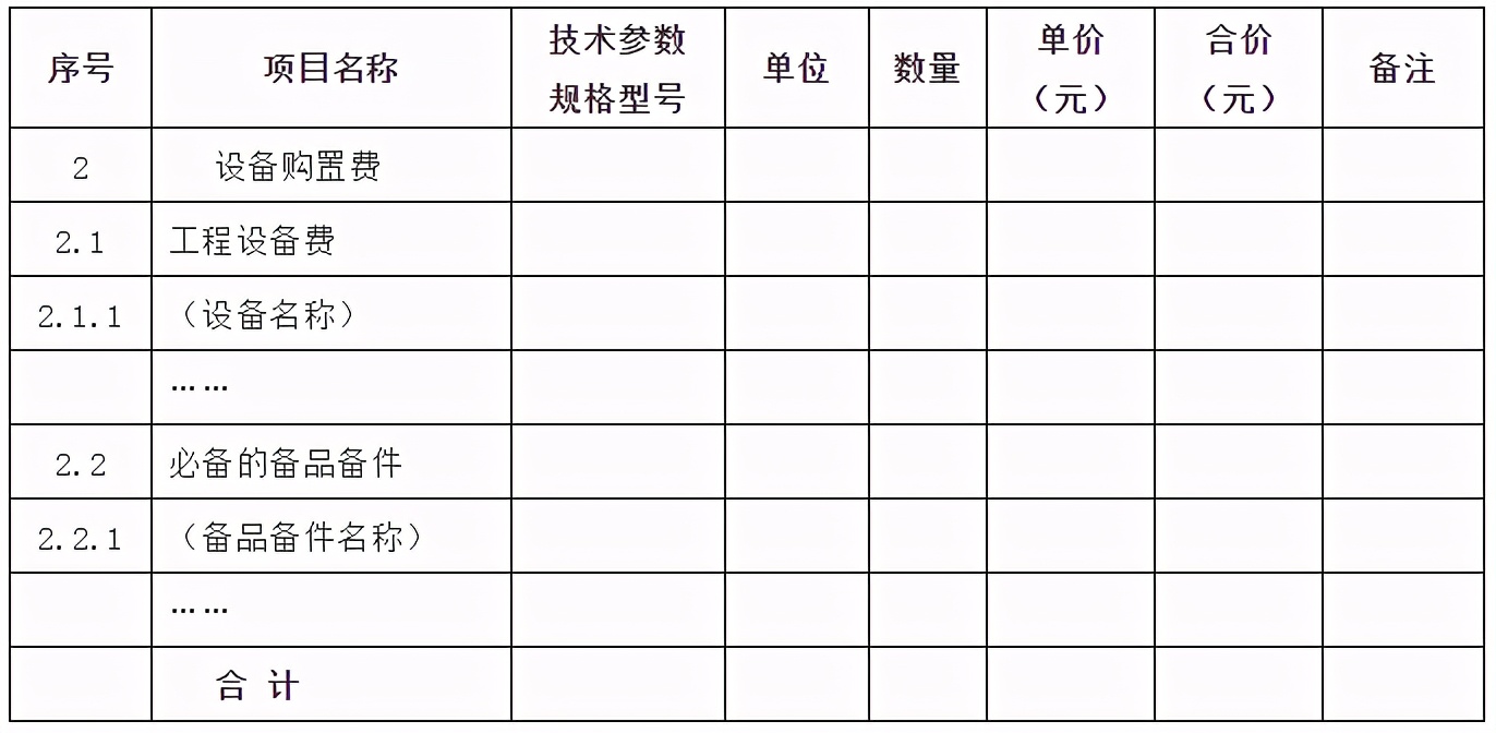 注 招标人应详细列明工程设备的技术参数、规格型号、计量单位、数量,以及所需备品备件的要求。该表内所有列项的工程设备和备品配件清单的完整性和准确性由招标人负责。