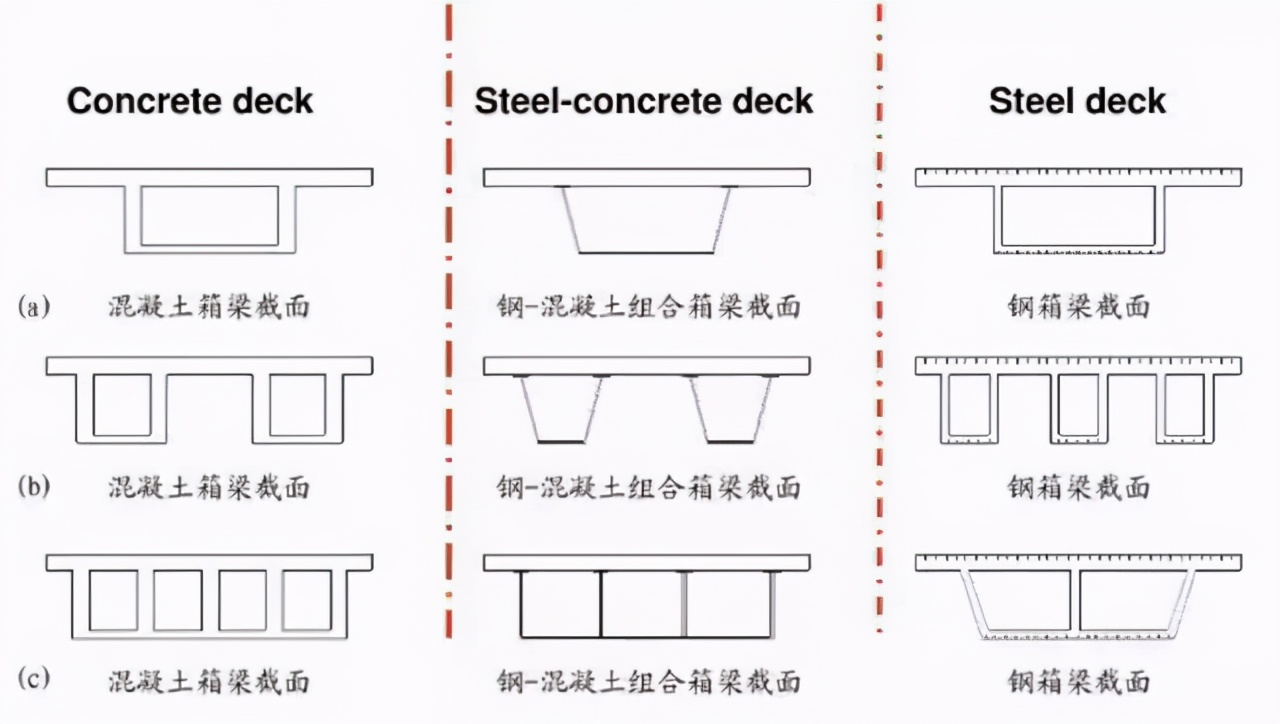 为了抵抗梁截面的弯矩和扭矩,故而在弯梁桥设计中多采用横向强度也很高的箱形截面。