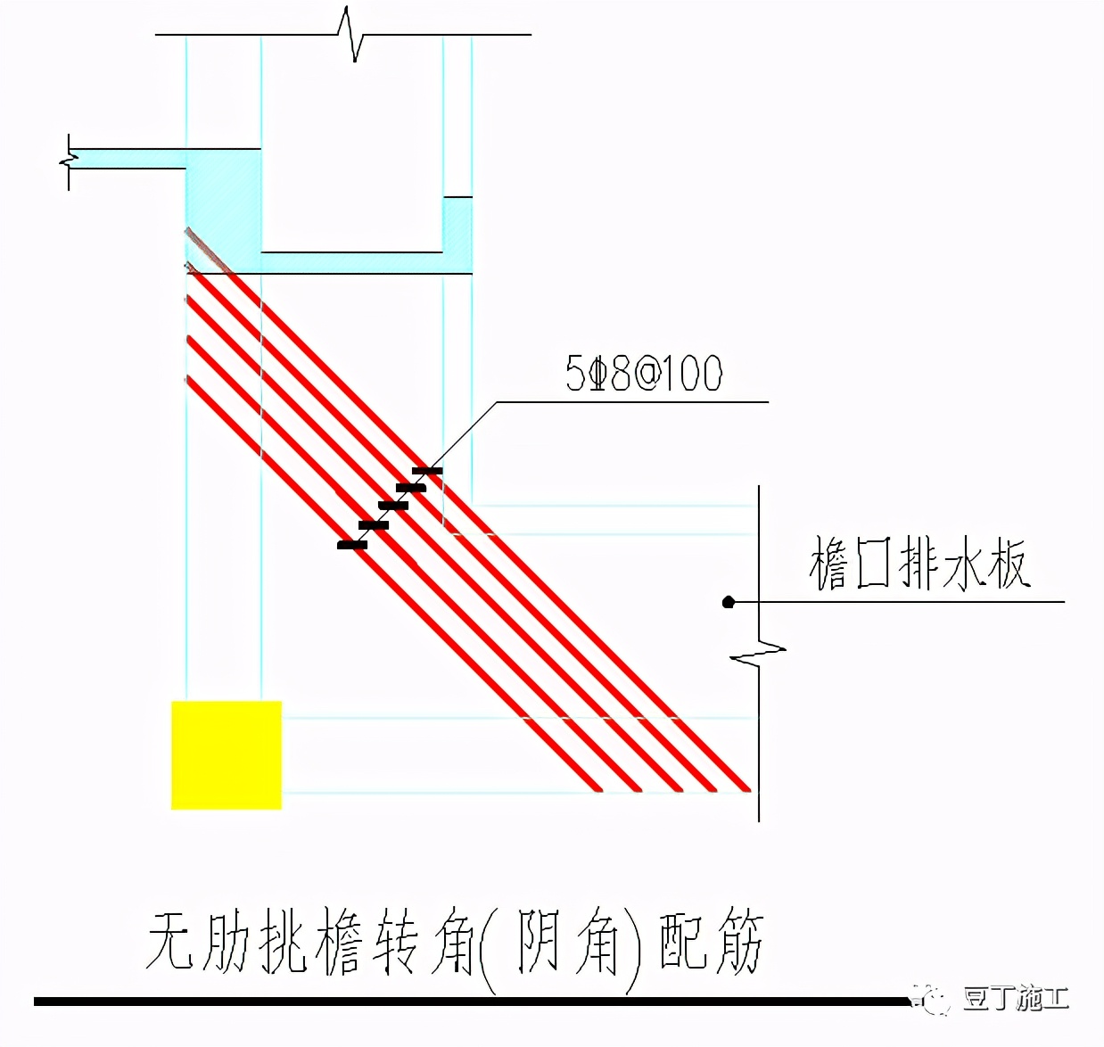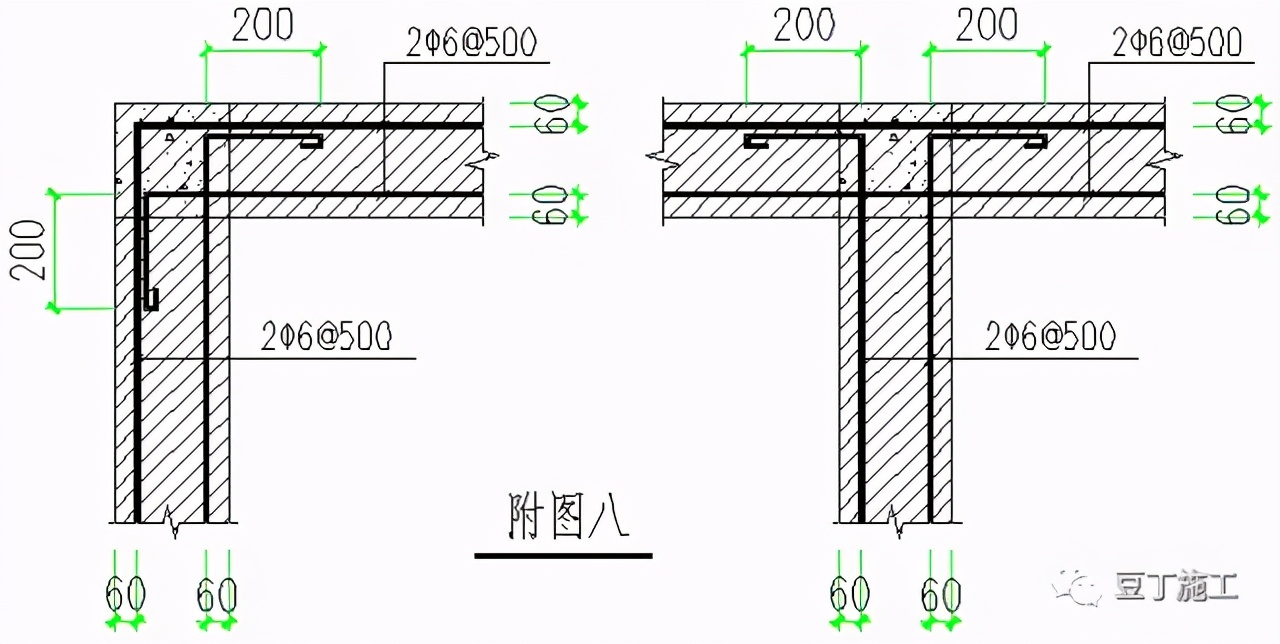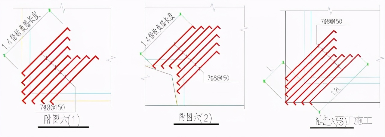 6、外墙转角处板上部附加钢筋、内墙阳角处板上部附加钢筋、悬挑板阳角附加钢筋配置分别详见附图六(1)、(2)、(3):