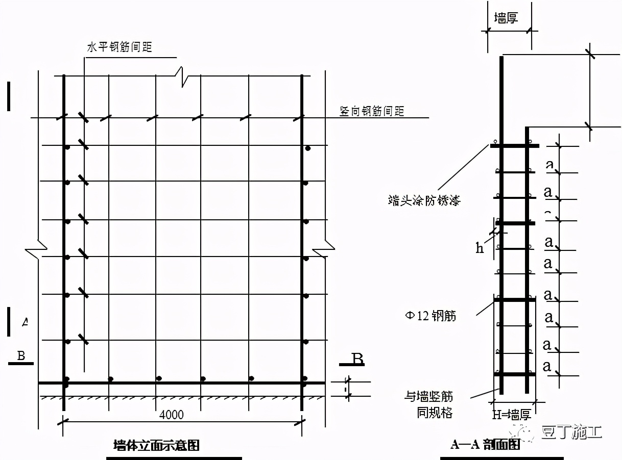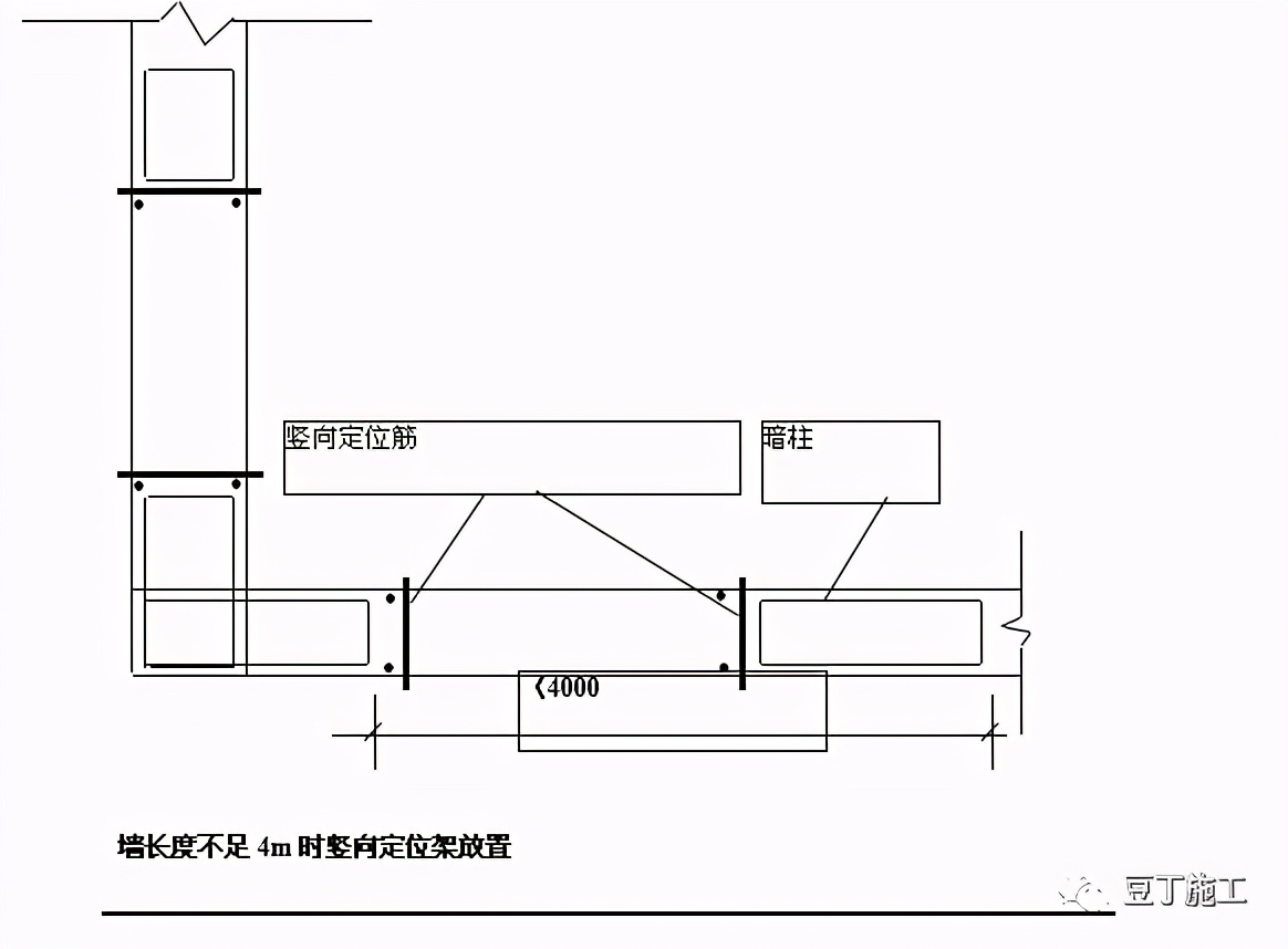 制作方法:梯架钢筋与墙竖向钢筋同规格、同牌号,要求2根梯架钢筋一长一短,留出绑扎搭接接头错开距离L,上中下至少设置3根与墙同宽的梯凳筋(兼做撑筋),两端必须用砂轮切割机切平并涂上防锈漆,其余梯凳筋长度应为H-10mm(即梯凳筋端头保护层为5mm),梯凳筋与梯架筋点焊即可。