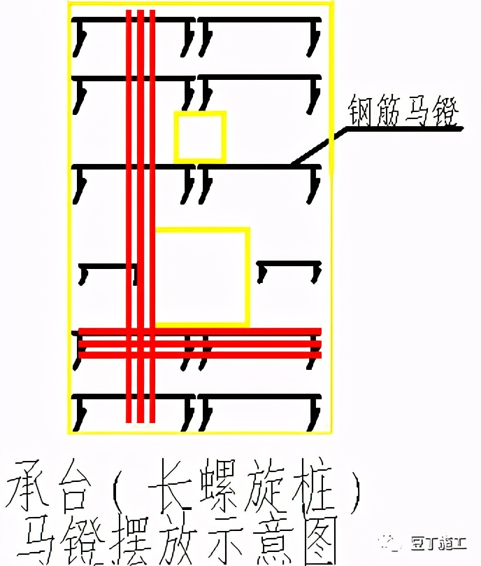 2)承台钢筋绑扎先铺底板下层钢筋。根据设计和规范要求,决定下层钢筋哪个方向钢筋在下面,参照16G101-1第66-70页安装,绑完下层钢筋后,按间距0.8m 左右设置钢筋马凳,马凳及附加钢筋应支设在下层钢筋网上,不得直接落在保护层,在马凳上摆放纵横两个方向定位钢筋,钢筋上下次序及绑扣方法同底板下层钢筋。马凳高度H=承台高—混凝土保护层厚—上层双向钢筋直径—下部钢筋单向钢筋直径,桩承台采用下图的钢筋马凳)间距800mm 左右设置,如下图: