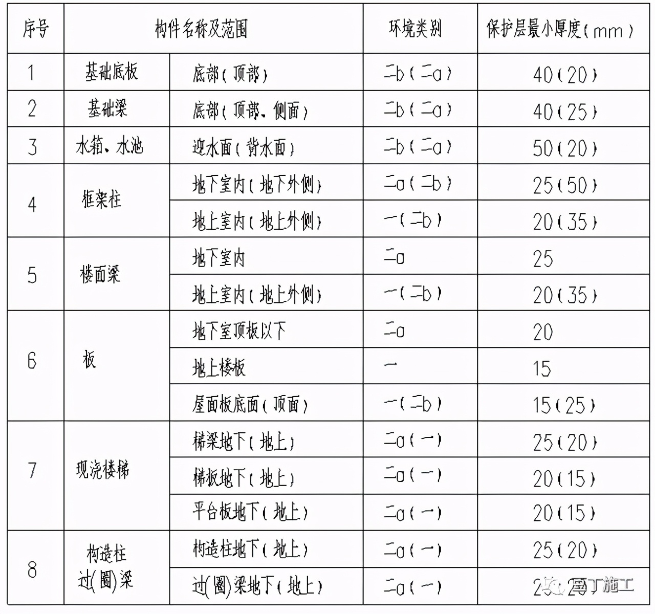 注:保护层厚度不应小于钢筋公称直径,当梁柱中纵向受力钢筋保护层厚度大于40应在混凝土保护层中构件表面10处全面增设φ4@200*200钢筋网片。独立基础、条形基础及地梁的保护层厚度为40mm,地下室及水池、长螺旋桩、人工挖孔桩、桩帽、地梁、承台的保护层厚度为50mm。