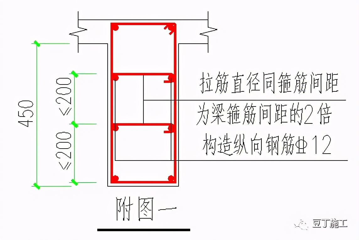 1、当梁的腹板高度≥450mm时,在梁的两个侧面应沿高度配置纵向构造钢筋,其间距≤200mm;梁的两个侧面纵向构造钢筋除各设计图纸已注明者外其余均按照附图一配置: