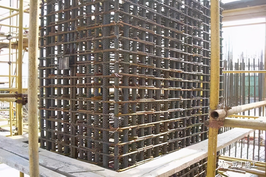 在绑底板的同时做好底板梁的绑扎,即先先绑东西向后绑南北向的方法排列钢筋。其接头位置“下层铁在跨中,上层铁在支座”。梁板式基础部位钢筋接头必须按50%错开,要严格按照配料单的顺序及位置准确排放基础底板下铁保护层为40(50)㎜,上铁为30mm。板上、下铁中间用马凳铁支起,间距800mm,马凳高度=底板厚-上下保护层-上层双向钢筋直径-下层单向钢筋直径。
