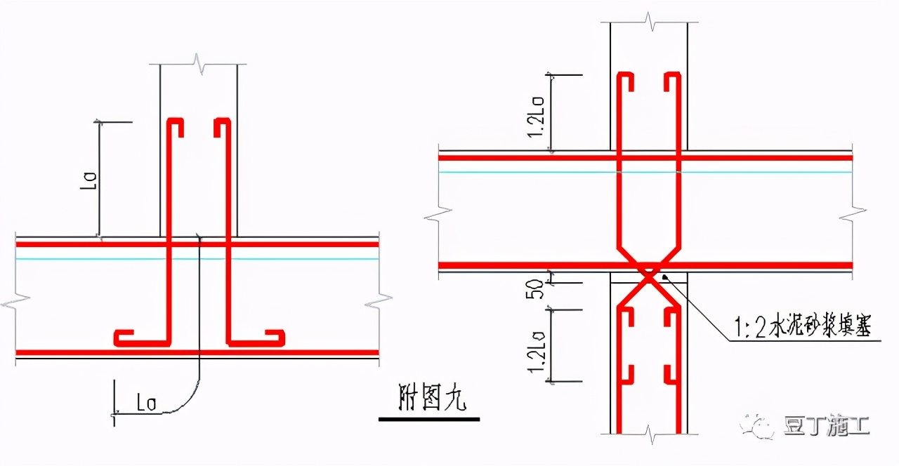主次梁相交处主梁附加筋构造见结施图纸附图二;当次梁高度大于主梁时,主梁附加箍筋构。