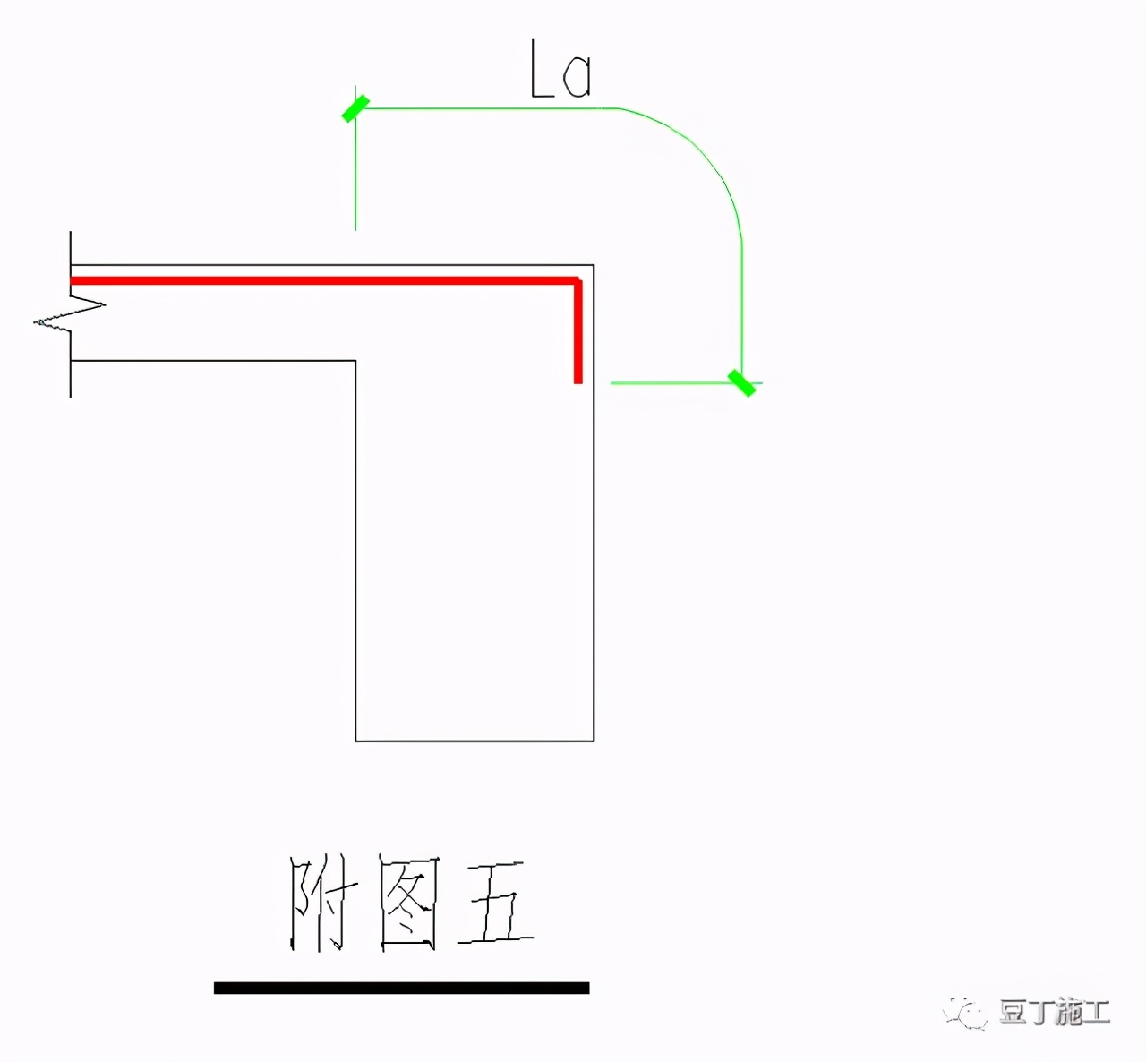 5、现浇板支座处配筋中间支座处板顶标高不同时,负筋在梁或墙内的锚固应满足受拉钢筋最小锚固长度的要求,构造详见附图五: