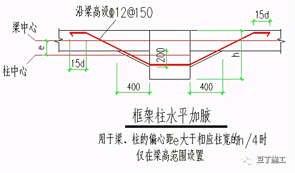 当梁与柱墙外皮齐平时,梁外侧纵向钢筋应稍作弯折置于柱墙主筋内侧,并在弯折处增加二道梁箍筋,其间距50mm。