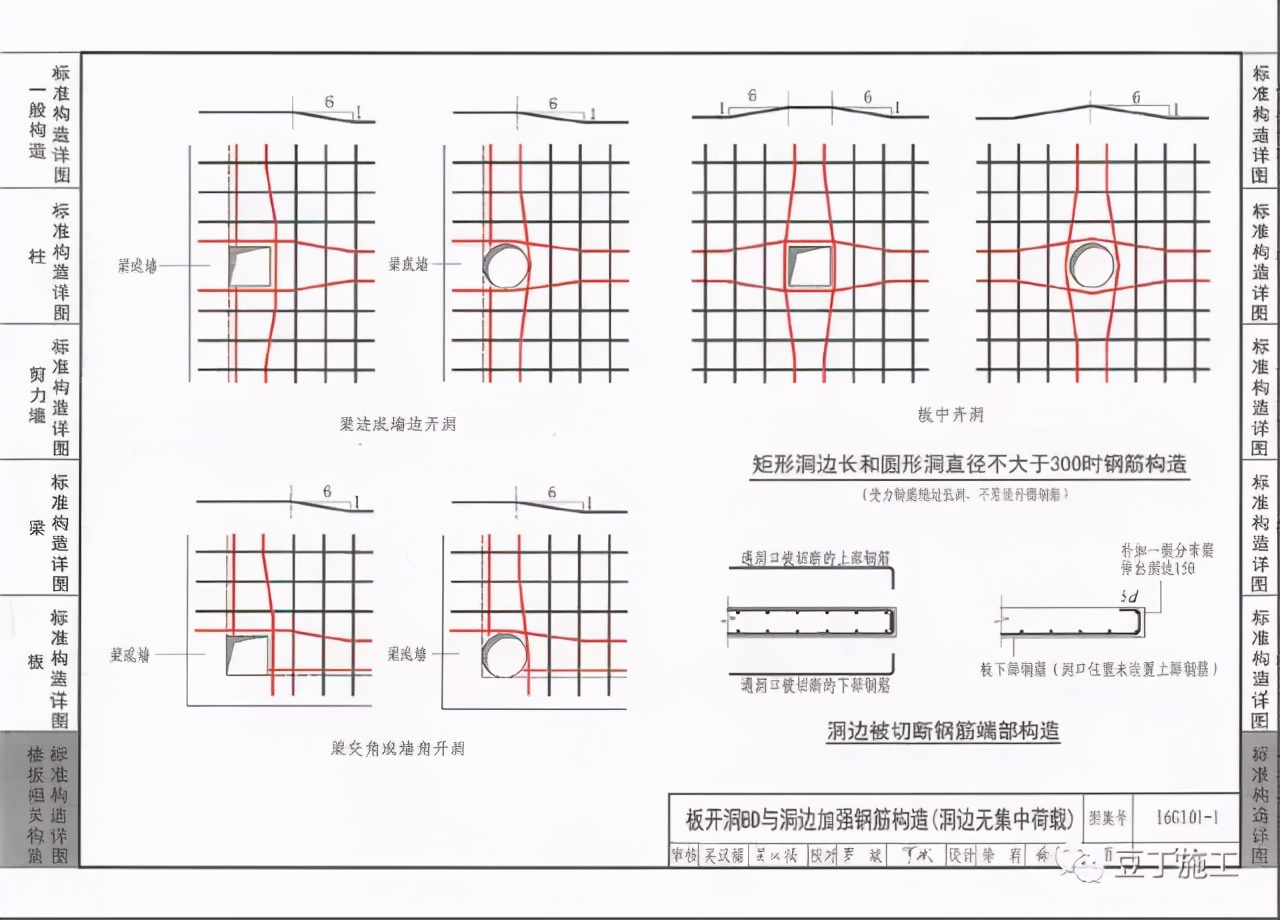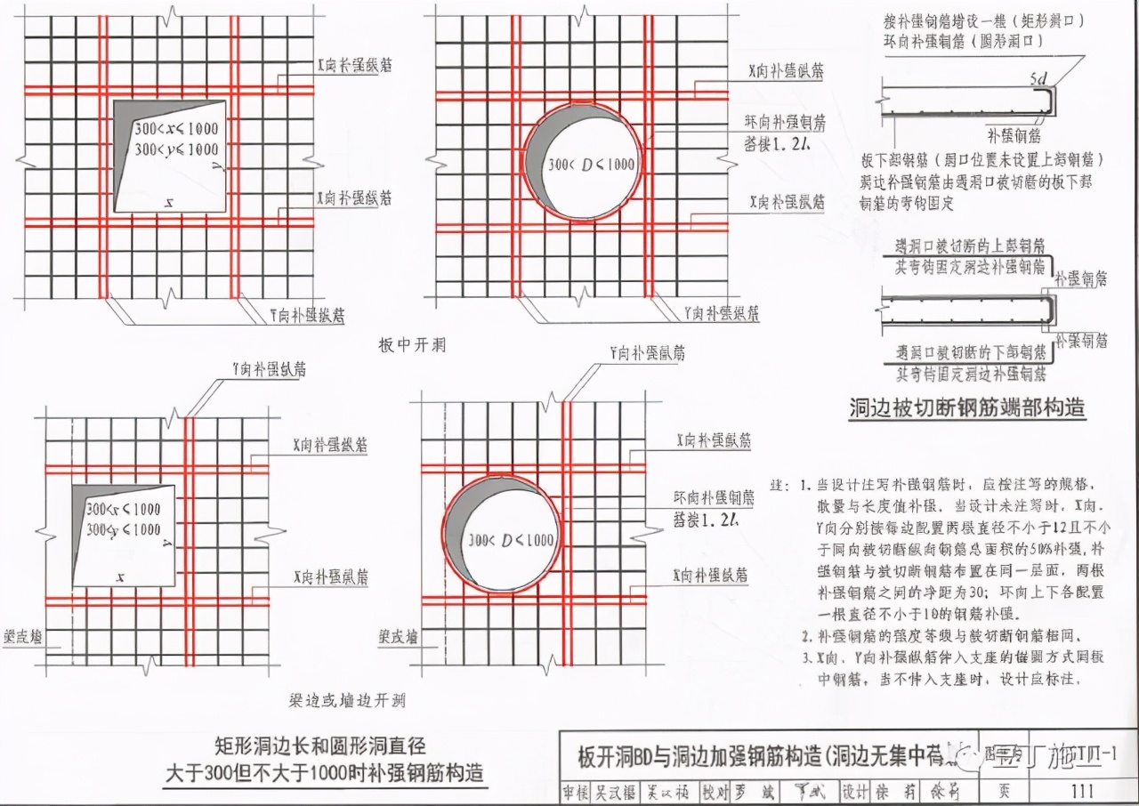 (3)板上孔洞除结施图已标注的大洞外,尚应配合各专业图预留,当孔洞尺寸不大于300时,钢筋绕过洞口,参照图集16G101-1第110页;孔洞尺寸大于300小于1000时,应按参照 16G101-1图集第111页,采取洞边加强措施。