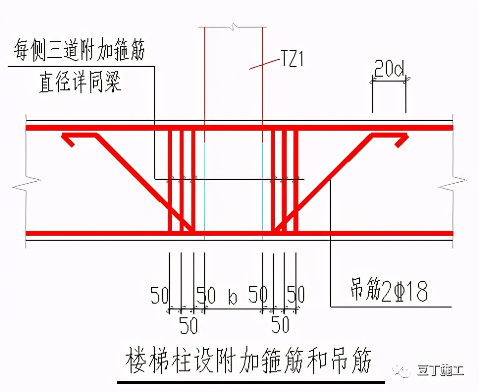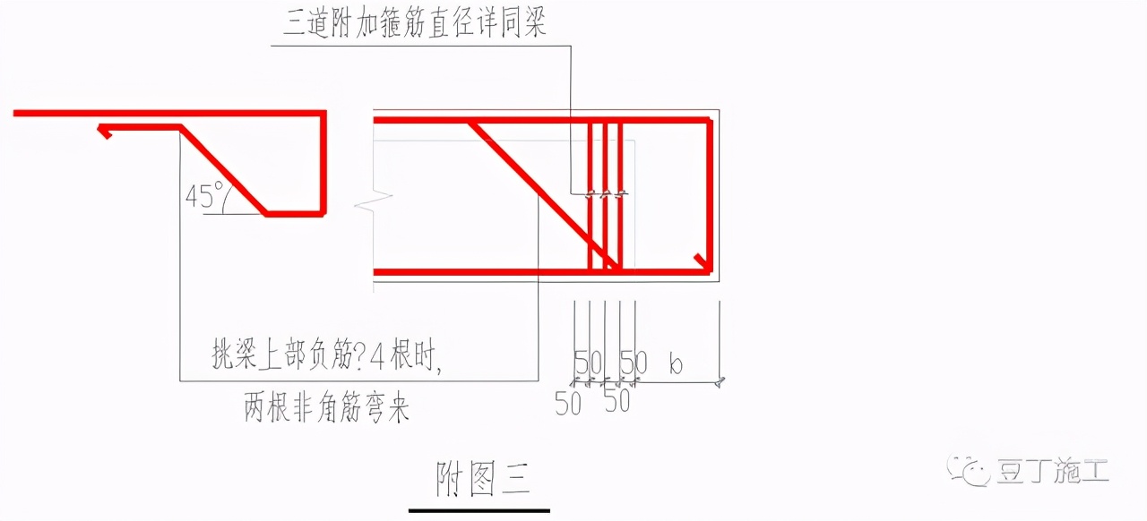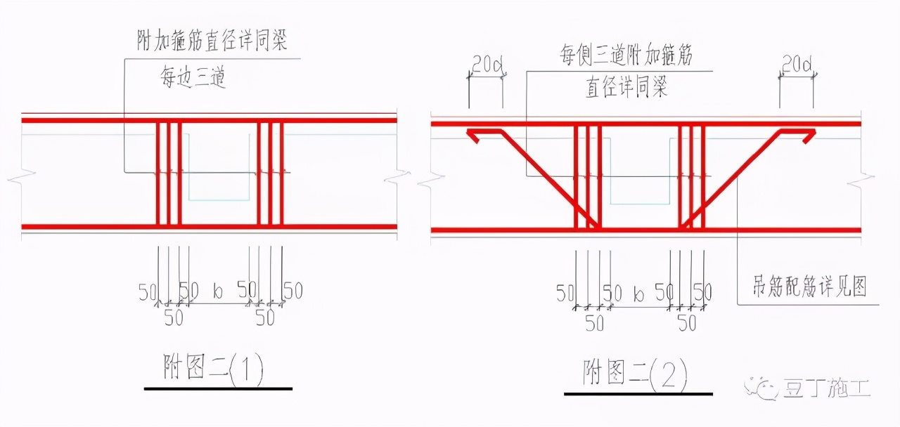 2、主次梁交接处未特别注明者均按照附图二要求配置附加横向钢筋: