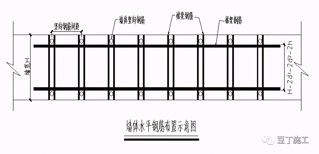 制作方法:按照混凝土墙体竖向钢筋间距和墙体宽度,采用12或14二级钢焊接。要求梯凳筋两端必须用砂轮切割机切平,与墙同宽焊接在梯架钢筋上,梯架筋间距为H-2d1-2d2-2h(d1为竖向钢筋直径,d2为水平钢筋直径,h墙体保护层厚度),每两根梯凳筋控制一根墙体竖向钢筋,使其不偏位、不跑位。