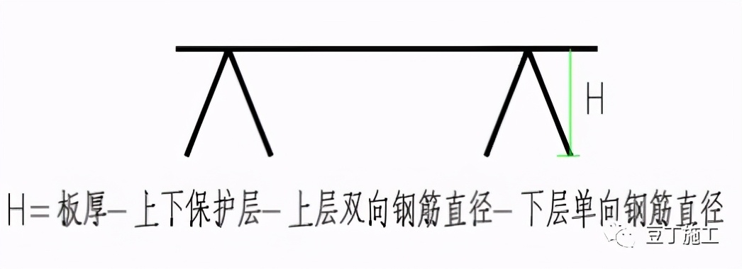 (4)绑扎一般用八字扣,除外围两根筋的相交点全部绑扎外,其余各点可隔点交错绑扎(或全部绑扎)。如板为双层钢筋,两层筋之间须加钢筋马凳以确保上部钢筋的位置。为确保上部钢筋的位置,在两层钢筋间加设马凳铁间距800mm。h=楼板设计厚度—上下保护层—上层双向钢筋直径—下层单向钢筋直径。