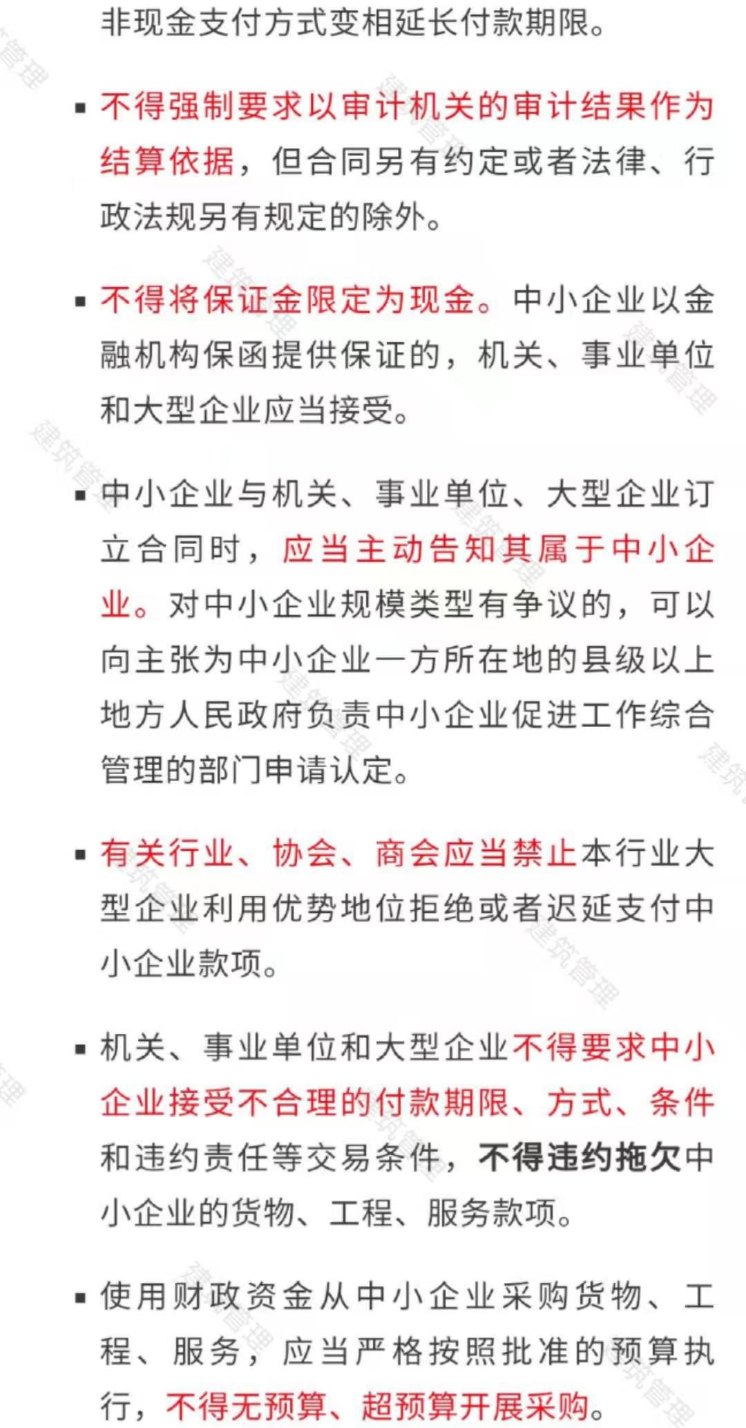 第六条 机关、事业单位和大型企业不得要求中小企业接受不合理的付款期限、方式、条件和违约责任等交易条件,不得违约拖欠中小企业的货物、工程、服务款项。