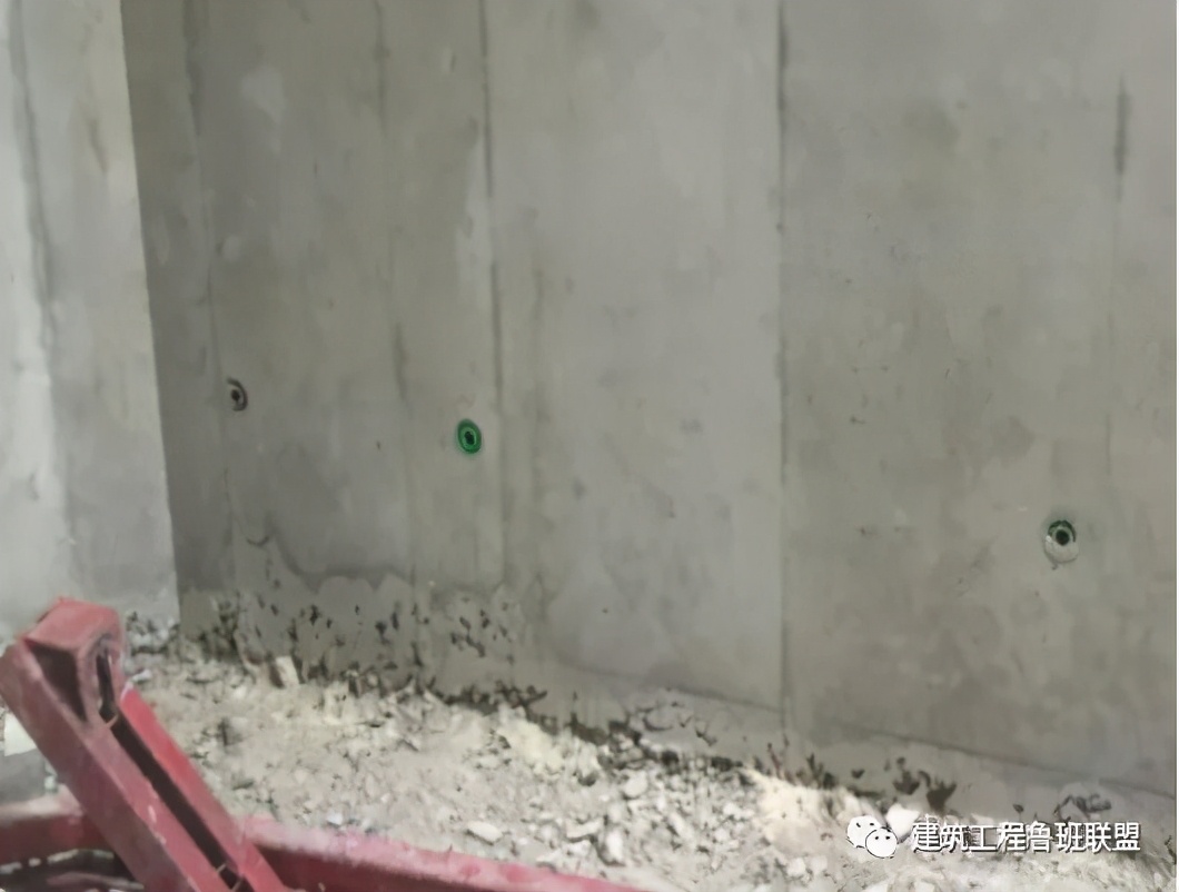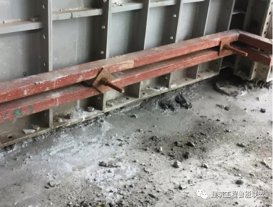 应对:模板边缘水泥浆未清理干净,拼缝不严,导致漏浆,在铝模拆除后必须立即对模板进行清理。
