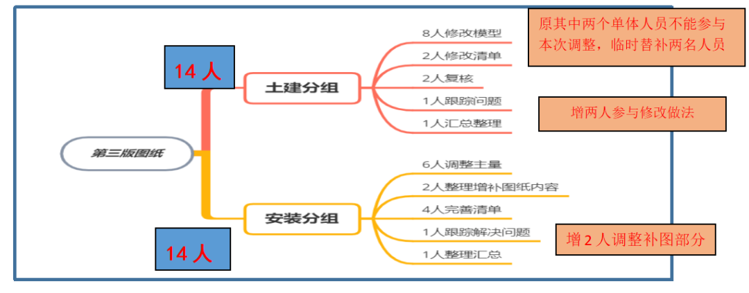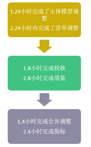 1. 第二次控制价调整,时间缩短为三天,但是根据叠图对比,图纸除了轴网、柱网变化不大,其他变化非常大需要重新建模,询匠团队迅速从匠人库中筛选2名土建人员、5名安装人员,进行量的调整;2. 安装专业系统较多,为了保证能在短时间内调整完成,增加了近一倍的人员,日夜工作;