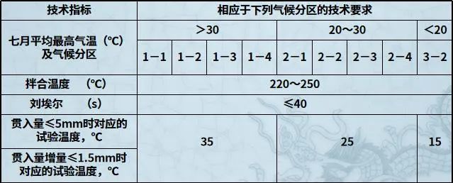 以空隙率≤2.5%作为沥青砂的防水性能标准,为保证低空隙率沥青砂的热稳性,沥青砂所使用的改性沥青等级应比当地沥青混合料用改性沥青等级提高一级,并满足以下要求如下表。