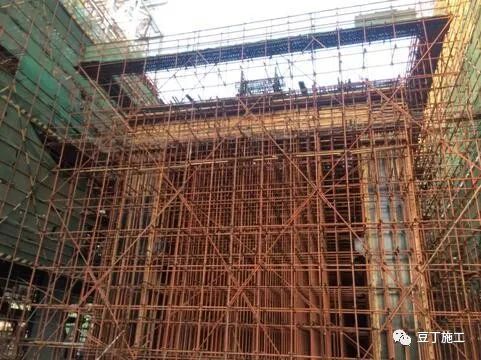 在底板或楼层板结构板面上上弹出梁的边线,便于确定梁两侧立杆位置及梁下立杆布置。先搭设梁两侧满堂架立杆,以梁侧立杆为起点,根据满堂架立杆间距布置搭设梁侧满堂支撑架。满堂架采用轮扣钢管架。搭设支架之前,在架体下脚要铺设50mm厚垫板,并且尽量保证楼层间的上下架体在一条直线上,根据立杆组合需要安装钢管底座。