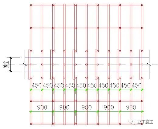 统一采用梁底增设一根立杆的搭设方式,梁宽方向间距(250+梁宽+250)根据梁宽尺寸进行调整,选用900、1200两种间距。沿梁跨方向立杆间距匹配满堂架立杆间距,间距450mm。两侧布置2~4排对拉螺杆。