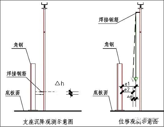 高大模板支撑系统在混凝土浇筑过程中和浇筑后一段时间内,由于受压可能发生一定的沉降和位移,如变化过大可能发生垮塌事故。为及时反映高支模支撑系统的变化情况,预防事故的发生,需要对支撑系统进行沉降和位移监测。