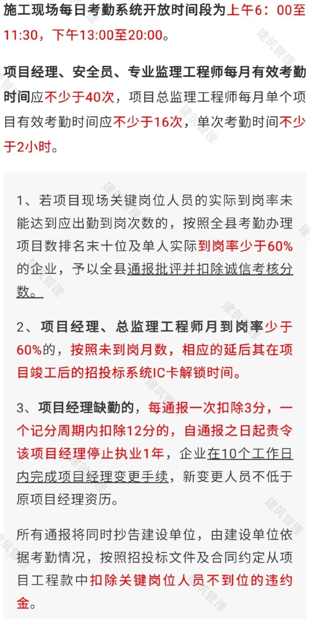 此前,全国各地已有不少省市对施工现场项目管理人员的考勤率作出了明确规定。