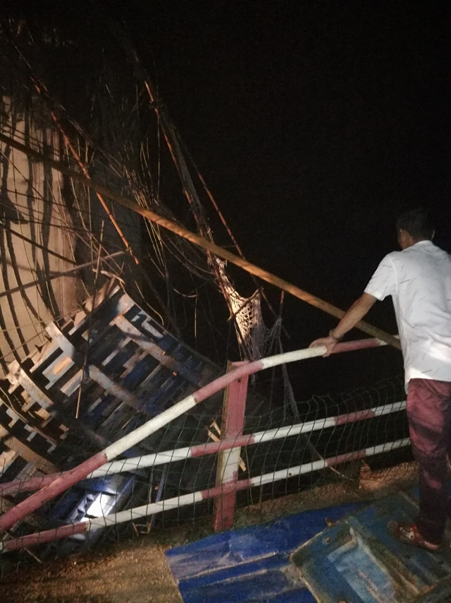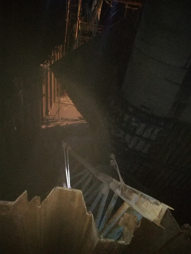 当第16车罐车的混凝土泵送完后,由李某贵和杨某俊两人完成了振捣,此时杨某俊与田某海及王志某一起在模板顶部外侧的作业平台上准备休息一会儿,李某贵因口渴从安全爬梯下去栈桥平台上喝水,当李某贵下至离模板顶部约有3m高(即20.5m墩身高)时(23时51分许),突然“呯”的一声巨响,模板发生爆模引起坍塌(事故现场如图2-1、图2-2、图2-3、图2-4所示),田某海、杨某俊和王志某随坍塌的模板和混凝土一同坠落,李某贵听到响声后,双手紧紧抱住安全爬梯的护栏钢管,致右前额、右手手臂和腰部皮外伤。王志某(泵车操作工)、田某海和杨某俊在坍塌事故中失踪。