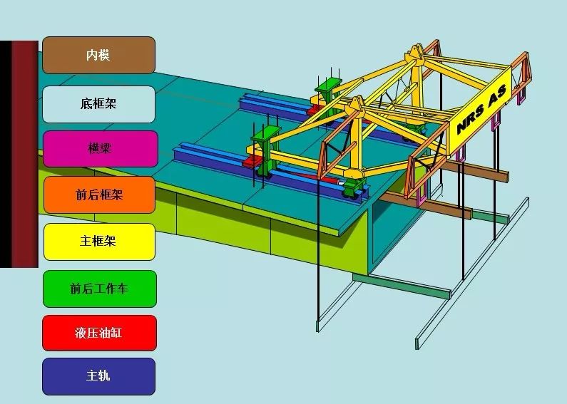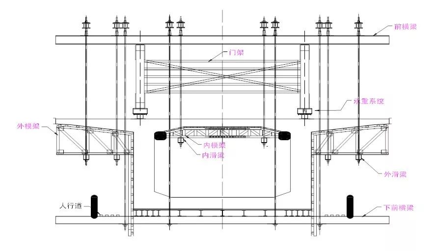 挂篮锚固悬挂在已施工梁段上,为下一节段施工作业提供空中平台。完成一个节段施工后,挂篮即可前移并固定,进行下一节段的施工,如此循环直至悬臂灌注完成。