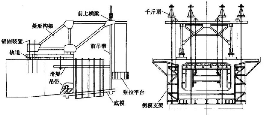 前后横梁、底模纵梁可根据具体情况为型钢式或桁架式。