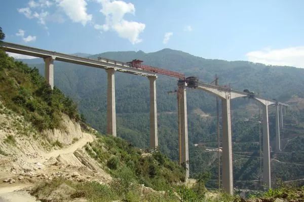 多用于斜拉桥施工,因为节段长度较大,一般挂篮难以达到悬臂刚度。有现成的斜拉索可以利用,作为挂篮的前支点。