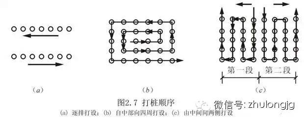 根据桩的密集程度,打桩顺序一般分为逐段打设、自中部向四周打设和由中间向两侧打设三种。