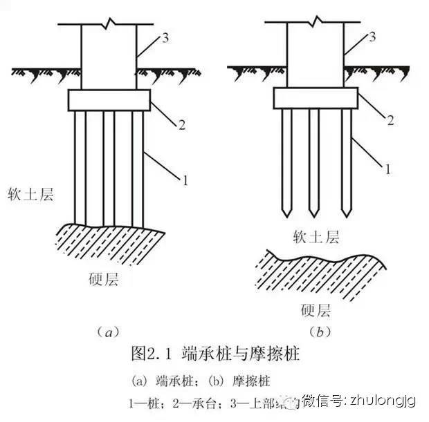 桩基础是一种常用的深基础形式,它由基桩和连接于桩顶的承台共同组成。若桩身全部埋于土中,承台底面与土体接触,则称为低承台桩基,若桩身上部露出地面而承台底位于地面以上,则称为高承台桩基。建筑桩基通常为低承台桩基础,而在桥梁、码头工程中常用高承台桩基础。
